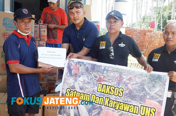 FOKUS JATENG – SOLO – Bencana banjir dan tanah longsor yang terjadi di daerah Pacitan menggerakan Universitas Sebelas Maret (UNS) Surakarta menyalurkan bantuan Senin 4 Desember 2017. Bantuan berupa sembako, pakaian, dan obat-obatan ini dikirim ke masyarakat Desa Sirnoboyo, Pacitan. Bakti sosial UNS yang dikoordinasikan oleh Kepala Bagian Umum Iwan Wisnu Anggono didampingi Komandan Satpam UNS Surono.