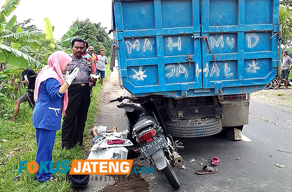FOKUS JATENG – SRAGEN – Nasip malang menimpa Suparno, sopir dump truk bernopol AD 1370 YB. Suparno meninggal dunia dengan luka serius setelah tertabrak sepeda motor Honda bernopol AD 3613 MP. Pemotor tersebut bernama Junianta dan memboncengkan Warsini.