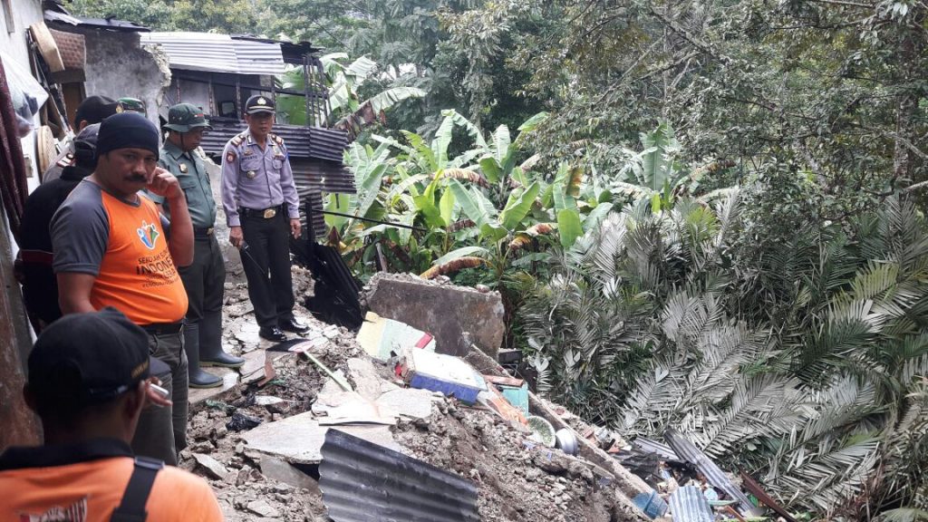 FOKUS JATENG-KARANGANYAR-Tiga rumah warga di lereng Gunung Lawu, tepatnya di Dusun Ngudal, Desa Nglebak, Kecamatan Tawangmangu, Karanganyar, rusak parah Rabu 27 Desember 2017. Sebab, rumah mereka tertimpa bencana tanah longsor. Kondisi itu memaksa pemilik rumah diungsikan ke tempat saudaranya.
