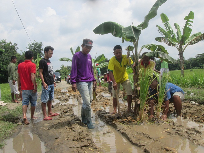 Selain membawa poster, mereka juga menanam pohon pisang di tengah jalan rusak. Para warga tersebut meminta dinas terkait segera terjun menangani jalan rusak penghubung daerah tersebut.