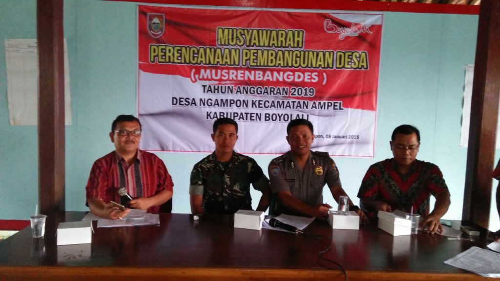 FOKUS JATENG-BOYOLALI-Desa Ngampon, Kecamatan Ampel, Boyolali, menggelar Musyawarah Perencanaan Pembangunan Desa (Musrenbangdes) Kamis 18 Januari 2018. Acara tersebut dihadiri Muspika Ampel, tokoh agama, tokoh pemuda, tokoh masyarakat, ketua RT-RW. Babinsa Ramil 05/Ampel Kodim 0724/Boyolali Serda Mujiono juga hadir dalam kegiatan ini.