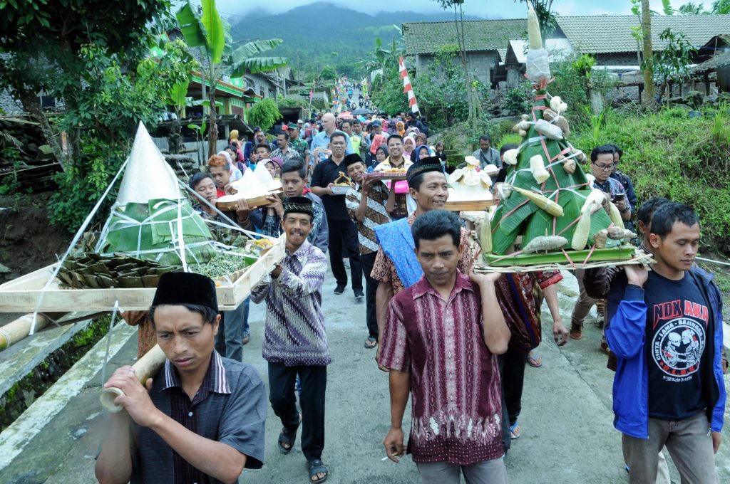 Warga secara sukarela membawa nasi tumpeng lengkap dengan lauk seperti tempe dan tahu goreng, ayam serta hasil kebun lainnya. Tumpeng dikumpulkan di rumah salah satu warga. Selanjutnya, tumpeng diarak sejauh 500 meter menuju temat acara di dukuh setempat.