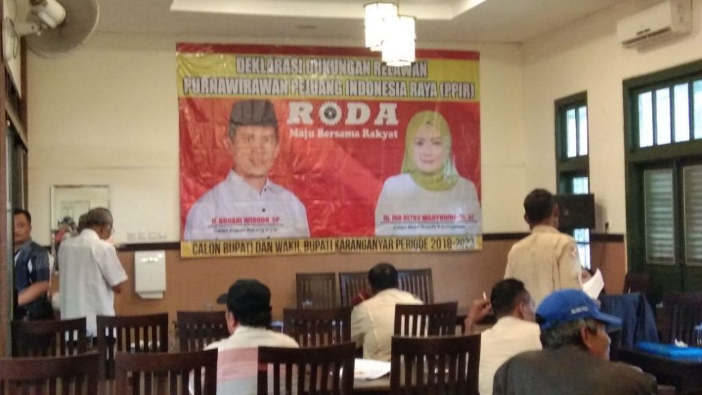 FOKUS JATENG-KARANGANYAR-Bakal pasangan calon Bupati dan Wakil Bupati Karanganyar Rohadi Widodo-Ida Retno Wahyuningsih (RoDa) mendapat amunisi baru. Dukungan tersebut datang dari Purnawirawan Pejuang Indonesia Raya (PPIR) Karanganyar.