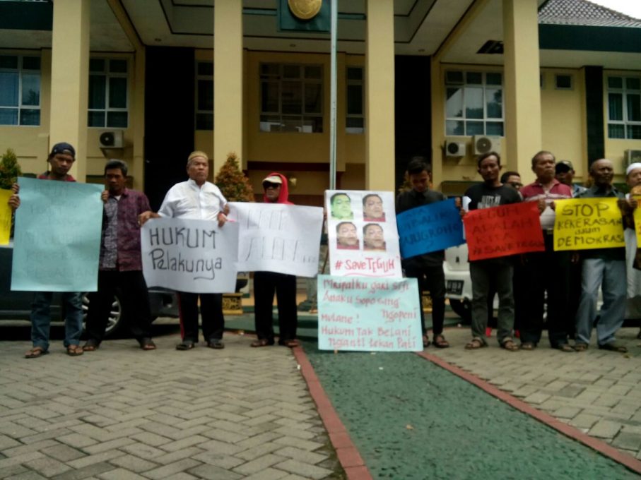 FOKUS JATENG-SRAGEN-Puluhan warga Desa Doyong, Kecamatan Miri, Sragen unjuk rasa di halaman Pengadilan Negeri (PN) Sragen Selasa 6 Februari 2018. Mereka menuntut keadilan untuk salah satu warga bernama Teguh Tri Jadi (40), yang menjadi korban pemukulan saat kontestasi Pilkades Doyong Sabtu 18 November 2017.