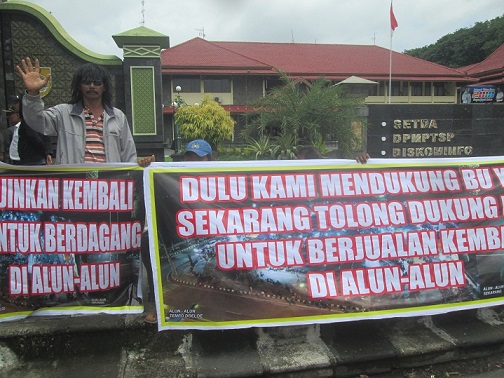 Mereka meminta kebijakan agar diizinkan berdagang kembali di alun-alun yang habis selesai direnovasi. Alun-Alun ini diresmikan pada malam tahun baru 2018.