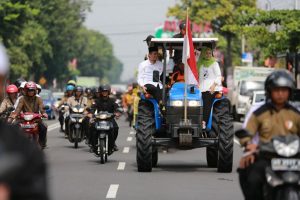 Pasangan Roda naik traktor menuju Gedung DPRD Karanganyar, Selasa 13 Februari 2018. (credit-Suroto/Fokusjateng.com)