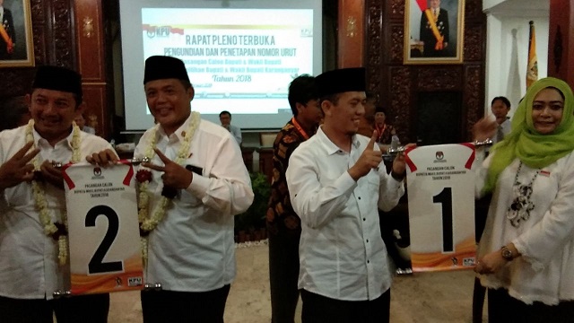 FOKUS JATENG-KARANGANYAR-Genderang pertarungan pemilihan kepala daerah (pilkada) di Kabupaten Karanganyar, Jawa Tengah mulai ditabuh. Dua pasangan calon bupati (cawabup) dan calon wakil bupati (cawabup) resmi mendapatkan nomor urut dalam pengundian yang digelar di gedung DPRD setempat, Selasa 13 Februari 2018.