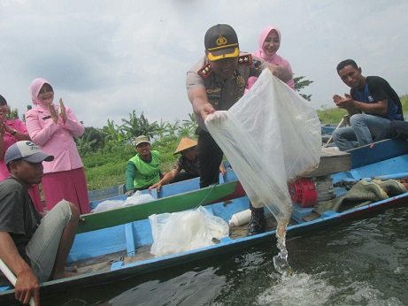 FOKUS JATENG-SRAGEN-Sebanyak 30 ribuan benih ikan air tawar seperti nila, mujair, tawes, tombro, dan lainnya ditebar di perairan Waduk Kedungombo (WKO), Kamis 15 Februari 2018. Acara ini digelar sebagai bentuk Bhakti Bhayangkari Hari Ulang Tahun (HUT) Yayasan Kemala Bhayangkari (YKB) ke-38.