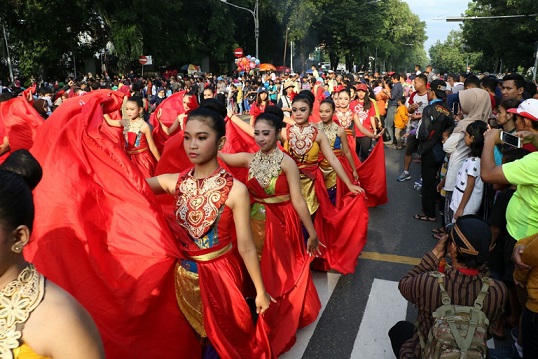 Tak hanya berjalan di area CFD, peserta kirab juga menjadi bagian penutup opera kolosal adheging kutha solo yang digelar di Koridor Jenderal Sudirman.