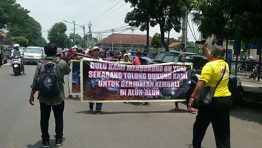 FOKUS JATENG-SRAGEN-Ratusan pedagang kaki lima (PKL) Alun-Alun Sragen kembali menggelar demonstrasi Senin 19 Februari 2018. Mereka menyampaikan aspirasi terkait pelarangan penggunaan alun-alun untuk berjualan. Mereka lantas melakukan aksi long march dari kantor Pemkab Sragen ke Gedung DPRD Sragen.