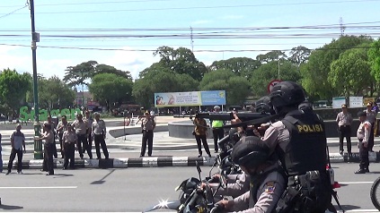 FOKUS JATENG-SRAGEN-Jajaran Polres Sragen terus mematangkan pengamanan gelaran Pemilihan Gubernur (Pilgub) Jateng 2018. Salah satu kesiapannya yakni dengan menggelar simulasi sistem pengamanan kota (sispamkot) yang digelar di Alun-Alun Sasono Langen Putro Sragen, Jumat 23 Februari 2018.