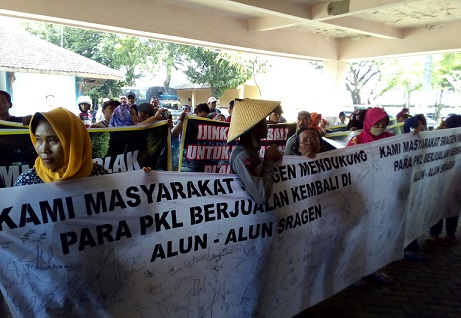 FOKUS JATENG-SRAGEN-Ratusan pedagang kaki lima (PKL) Alun-Alun Sasono Langen Putro Sragen, kembali menggelar aksi Senin 26 Februari 2018. Mereka jalan kaki mulai dari alun-alun hingga Gedung DPRD Sragen.