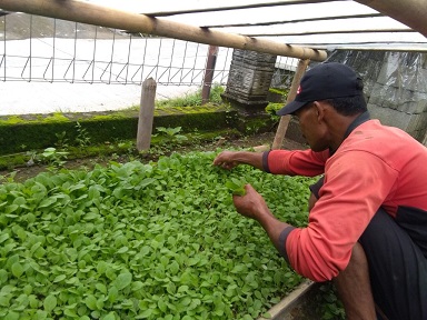 Benih yang disiapkan ini sudah dikemas dalam media khusus di teras rumah. Benih yang sudah mulai besar itu dipindah ke polibek sebelum ditanam di ladang. “Biasanya sebulan, lalu ditanam,” tutur Dika (56), salah satu petani warga Desa Gebyog, Kecamatan Selo.