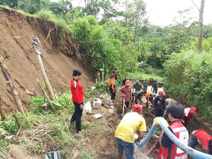 FOKUS JATENG-BOYOLALI-Tanah longsor menutup akses jalan penghubung Desa Cluntang-Desa Kembangsari, Kecamatan Musuk, Boyolali. Akses jalan itu sudah kembali terbuka Rabu 14 Maret 2018. Hal ini lantaran aksi cepat tim Siaga Bencana Berbasis Masyarakat (Sibat) PMI Boyolali.