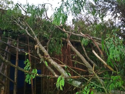 Rumah yang tertimpa pohon ini milik Harsono (48). Informasi yang dihimpun fokusjateng.com, angin kencang melanda secara tiba-tiba. Lantas pohon trembesi di depan rumah Harsono tumbang menimpa bagian atap. Genting dan teras rumah mengalami kerusakan.
