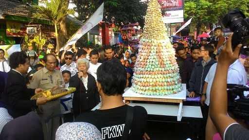 FOKUS JATENG-BOYOLALI-Umat Kristiani Jemaat Gereja Sidang Jemaat (GSJ) Imanuel Boyolali merayakan Hari Paskah, Minggu 1 April 2018. Para Jemaat ini menggelar kirab gunungan telur di gelaran car free day (CFD). Selain mengirab telur dan hasil bumi, mereka juga memanjatkan doa untuk pemilu damai, baik pilgub Jateng maupun pilpres 2019.