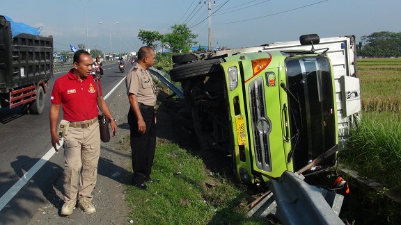FOKUS JATENG-BOYOLALI-Kecelakaan tunggal terjadi di jalan raya Semarang-Solo, tepatnya di depan Mapolsek Banyudono, Boyolali, Rabu pagi 11 April 2018. Yakni sebuah truk kontainer pengangkut minuman botol terguling ke tengah sawah. Akibat kejadian ini, talud dan besi pembatas ikut ambrol.