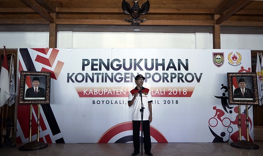 FOKUS JATENG-BOYOLALI-Ratusan atlet yang akan maju dalam Pekan Olahraga Provinsi (Porprov) Jawa Tengah (Jateng) kontingen Boyolali dikukuhkan Rabu 18 April 2018. Pengukuhan berlangsung di Pendapa Alit Rumah Dinas (Rumdin) Bupati Boyolali.