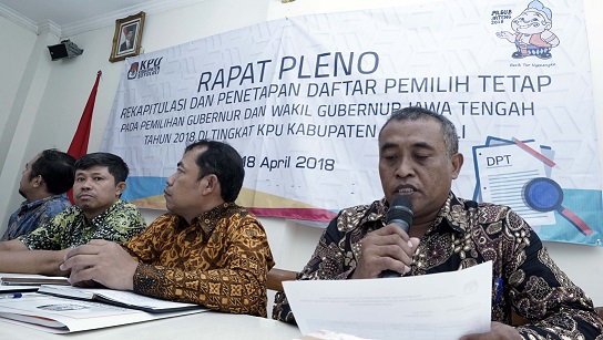 Hal itu disampaikan KPU Boyolali saat Rapat Pleno penetapan DPT di Hotel Puri Merbabu, Rabu 18 April 2018. Rapat Pleno tersebut dihadiri pengurus Parpol, Panwas Boyolali, Panwascam dan Dinas Kependudukan dan Catatan Sipil (Disdukcapil) Boyolali.