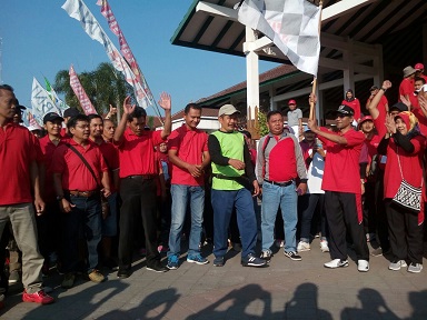 FOKUS JATENG-BOYOLALI-Ribuan buruh di wilayah Boyolali tidak menggelar demonstrasi menyampaikan aspirasi pada peringatan Mayday (Hari Buruh Sedunia) 1 Mei 2018. Mereka memilih mengikuti gerak jalan yang digelar Pemkab Boyolali dan berbagai stakeholder di Alun-Alun Kidul Kompleks Kantor Pemkab Boyolali. Seperti Badan Penyelenggara Jaminan Sosial (BPJS) Ketenagakerjaan yang ikut berpartisipasi dalam kegiatan tersebut.