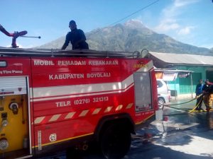 FOKUS JATENG-BOYOLALI-Pemkab Boyolali mengerahkan dua mobil pemadam kebakaran (damkar) ke wilayah Kecamatan Selo. Damkar plus kru meluncur ke lokasi dampak erupsi Merapi untuk membersihkan debu vulkanis di pusat perekonomian Selo.