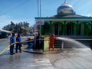 Petugas damkar menyemprotkan air ke halaman masjid di Selo untuk membersihkan debu vulkanis Jumat 1 Juni 2018. (credit-Istimewa/Fokusjateng.com)