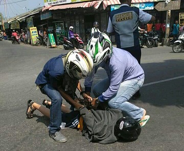 FOKUS JATENG-SRAGEN-Aksi heroik terjadi di Jalan Raya Sukowati, Gemolong, Sragen, tepatnya di depan Toko Mas Cap Bagong Rabu 6 Juni 2018. Yakni personel polisi dari Polsek Gemolong melumpuhkan seorang terduga mengederkan emas palsu.