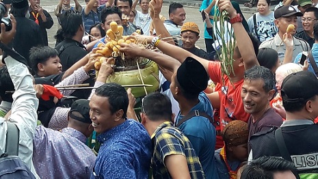 Sementara itu prosesi Grebeg berjalan meriah. Dua gunungan yang dibawa ke halaman Masjid Agung langsung ludes diperebutkan masyarakat hanya dalam hitungan menit.