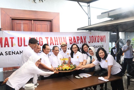 Usai saling memberikan ucapan selamat ulang tahun ke Jokowi yang genap berusia 57 tahun, jajaran pemimpin dan penasihat DPC Pronata Solo melakukan potong tumpeng kuning sebagai tanda syukur atas ulang tahun Presiden Joko Widodo (Jokowi).