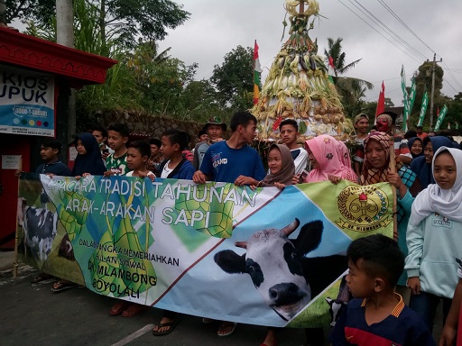 Selain gunungan hasil bumi, warga Dukuh Mlambong, Desa Sruni, Kecamatan Musuk, Boyolali, juga menggiring seluruh sapi Jumat 22 Juni 2018. (credit-Yulianto/Fokusjateng.com)