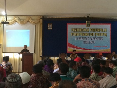 FOKUS JATENG-KARANGANYAR-Lahan persawahan di Kabupaten Sragen dimungkinkan paling banyak menerima debit air dari Waduk Gondang, Desa Gempolan, Kecamatan Kerjo, Karanganyar, Jawa Tengah. Hal ini diungkapkan Sekretaris Daerah (Sekda) Karanganyar Samsi, di acara Pemberdayaan Perkumpulan Petani Pemakai Air (P3A/GP3A) se-Kabupaten Karanganyar 2018, Selasa 24 Juli 2018.