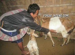 Pemuda membangunkan kambing yang sedang hamil di momen gerhana bulan. (credit-Huriyanto/Fokusjateng.com)