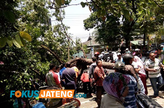 FOKUS JATENG – BOYOLALI – Pohon Pinisium yang berada di pinggir Jalan Pandanarang, barat Kantor Pos Boyolali, tumbang Jumat 21 September 2018. Tumbangnya pohon nyaris mengenai dua orang dan satu balita yang berada tak jauh dari lokasi.