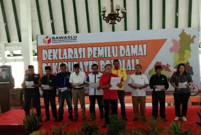 FOKUS JATENG-BOYOLALI-Badan Pengawas Pemilu (Bawaslu) Boyolali menggelar deklarasi pemilu damai Senin 1 Oktober 2018. Deklarasi ini mengajak seluruh stakeholder di wilayah Boyolali untuk meminimalkan potensi pelanggaran Pemilu 2019.