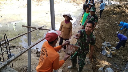 Tidak ketinggalan berbagai lapisan masyarakat dari orang tua,pemuda-pemudi, laki-laki dan perempuan rela kepanasan tersengat teriknya matahari serta keringat yang bercucuran membasahi badannya tetap semangat ikut dan andil membangun embung. Anggota TNI bersama warga dalam melaksanakan penyiapan material menggunakan tehnik berantai untuk memindahkan campuran dan material yang akan digunakan untuk pembangunan embung.