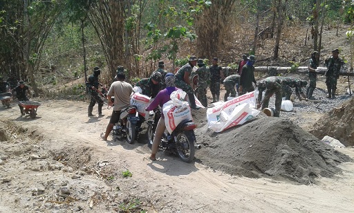 Pasir dan bahan material lainnya dibawa dari atas dipindah ke bawah. Karena jaraknya lumayan jauh, maka warga yang mengangkut material. Sedangkan prajurit TNI diminta untuk mengolah material di molen.