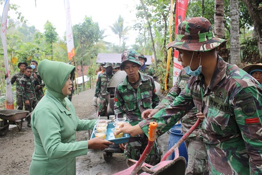 Dengan menggunakan nampan, nampak ibu-ibu berseragam khas isteri prajurit membagikan gelas-gelas berisi bubur sumsum lezat itu kepada seluruh pekerja. Baik dari TNI maupun masyarakat.
