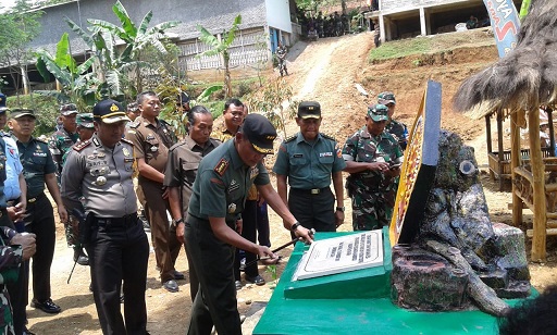 Danrem 074/Warastrama Kolonel Inf Widi Prasetijono menandatangani tugu prasasti di lokasi pembangunan embung sebagai tanda selesainya kegiatan TMMD yang didampingi Komandan Kodim 0725/Sragen dan pejabat para Kasi Korem 074/Warastratama.