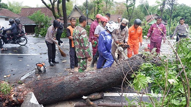 Seperti yang terlihat satu batang pohon turus Jalan Pandanaran, tepatnya di sebelah barat SMKN 1 Mojosongo tumbang ke arah jalan. Namun petugas Badan Penanggulangan Bencana Daerah (BPBD) bersama Satlantas Polres Boyolali, relawan dan warga bergegas menyingkirkan batang pohon tersebut.