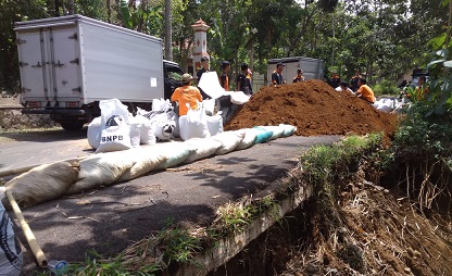 Pemasangan tanggul buatan dengan menggunakan karung berisi tanah, ini dilakukan oleh Badan penanggugalangn bencana Daerah (BPBD) serta warga sekitar, Sabtu 24 November 2018. Pantauan di lapangan, jalur kendaraan yang melintas di kawasan tersebut rawan mengalami longsor.