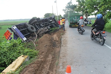 Tanpa diduga, lapisan tanah tepi cor beton ambles setelah diguyur hujan deras. Tak ayal, ban truk tidak bisa naik ke badan jalan, malah terguling ke tengah sawah.