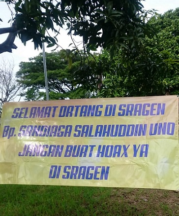 Spanduk tersebut sampai berjumlah puluhan dan tersebar di berbagai titik diwilayah pasar Bunder dan Sragen kota tempat dimana sandiaga uno berkunjung. Ada berbagai tulisan dari sepanduk yang terpasang, namun ada satu spanduk yang sedikit menarik perhatian isi tulisannya. ”Selamat datang disragen Bp.Sandiaga salahuddin uno, jangan buat hoax ya di Sragen”.