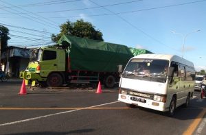 KECELAKAAN TUNGGAL: Rem Blong, Truk Gandeng Tabrak Traffic Light dan Median Jalan