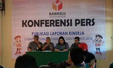 Komisioner Bawaslu Karanganyar Divisi Organisasi dan SDM Darsono mengatakan hal itu dalam konferensi pers publikasi laporan kinerja tahapan Pileg dan Pilpres 2019 di kantornya, Jumat 4 Januari 2019.