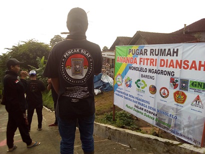Warga bersama ormas dan TNI serta Polri bergotong royong memperbaiki rumah Sunarno di Dukuh Wonolelo, Desa Ngagrong. Mereka bahu- membahu membangun rumah dari tembok dengan dukungan ormas Komunitas Masyarakat Peduli Kemanusiaan (Kompak), Suara Putra Merbabu (Panser) dan Gerakan Nasi Jumat (GNJ).
