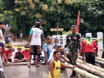 Mereka pun bergotong royong menebang puluhan batang bambu. Selanjutnya, batang bambu yang besar digunakan untuk gelagar jembatan darurat. Mereka juga membelah bambu lainnya untuk alas atau dasar jembatan.