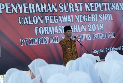 Hal tersebut dijelaskan Kepala Badan Kepegawaian, Pendidikan dan Pelatihan Daerah (BKP2D) Kabupaten Boyolali, Agus Santoso saat penyerahan SK CPNS Formasi Tahun 2018 Pemkab Boyolali, yang diselenggarakan di Pendopo Gede Kabupaten Boyolali, pada Kamis (28/2).
