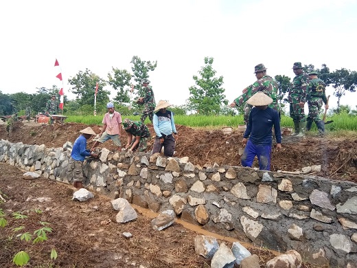 FOKUS JATENG-SUKOHARJO-Satgas Tentara Manunggal Membangun Desa (TMMD) Reguler ke 104 Kodim 0726/Sukoharjo pengerjaan pembangunan talud jalan di areal pertanian Desa Celep Kecamatan Nguter Kabupaten Sukoharjo.
