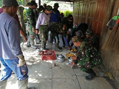 FOKUS JATENG-BOYOLALI-Pelaksanaan TNI Manunggal Membangun Desa (TMMD) Sengkuyung Tahap I tahun 2019 yang sedang dilaksanakan di Desa Ngleses, Kecamatan Juwangi, Kabupaten Boyolali masih terus dikerjakan setiap harinya. yang tidak kalah penting adalah keterlibatan ibu-ibu yang sehari-harinya menyiapkan makan dan minum bagi personel yang ikut dalam pekerjaan TMMD, Kamis 08 Maret 2019.