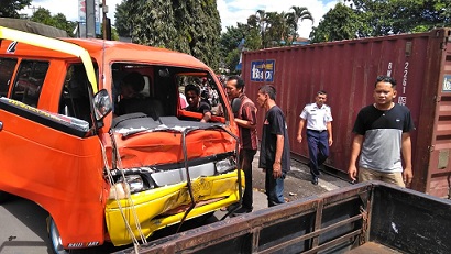 Tapi tidak demikian halnya dengan truk Hino yang dikemudikan Harianto, 45 yang berada di belakang angkot. Truk berwarna hijau ini terus melaju hingga akhirnya menabrak bagian belakang angkot hingga bodi penyok dan kaca pecah. Saat itu, angkot yang diperkirakan tak berpenumpang itu terus terdorong hingga kemudian menabrak truk X yang berada di depannya hingga kaca depan angkot pecah dan bodi depan ringsek.